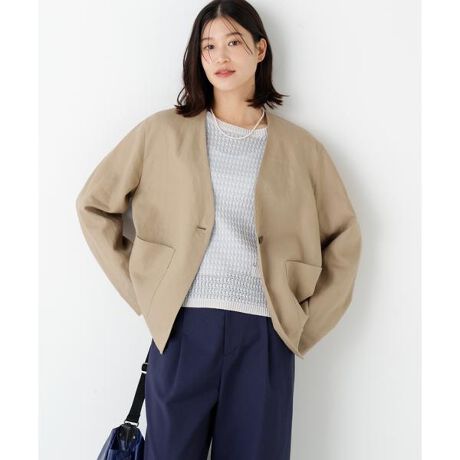 抜け感あるボックスシルエットのノーカラージャケットです。ひとつボタンや裾脇のスリットで軽さを出しています。