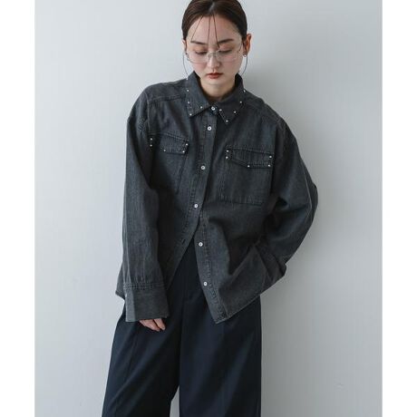 デニムのカジュアルな印象に、繊細なディテールを掛け合わせたデザインシャツです。薄手で非常に柔らかなデニム生地を使用することで、動くたびに生まれる自然なドレープが女性らしいしなやかなシルエットを演出します。最大のポイントは、顔周りと胸元に規則正しく配置されたスタッズ装飾。控えめながらも確かな存在感を放つこのアクセントが、シンプルなスタイリングを洗練されたモダンな装いへと引き上げてくれます。羽織りとしてもメインの一枚としても、日常のあらゆる場面で凛とした華やぎを添えてくれるアイテムです。
