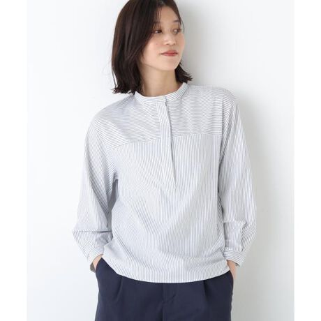前身頃上にボーダー使いしたヨークが見えてくるバンドカラージャージープルオーバーです。程よいショート丈でおつくりしています。