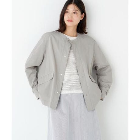 シンプルなノーカラージャケットを前立てのドットボタンできれい目に仕上げました。ややAラインのシルエットです。袖口はタブを閉めてたくし上げることでニュアンスを演出できます。