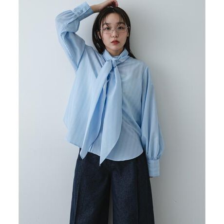 シワになりにくい軽量なシャツ素材を使用しているため、デスクワークや外出時でも型崩れを気にせず、常にクリーンな佇まいを保てます。最大の特徴であるボリューム感のあるボウタイは、身に纏うだけで立体的な美しさを生み出し、アクセサリー要らずで上品なコーディネートを完成させます。涼しげなサックスブルーのストライプ柄が、甘くなりすぎない爽やかな印象を与えてくれるため、オフィスシーンから休日のお出かけまで幅広く活躍する一着です。