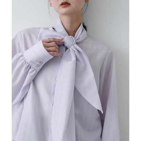 シワになりにくい軽量なシャツ素材を使用しているため、デスクワークや外出時でも型崩れを気にせず、常にクリーンな佇まいを保てます。最大の特徴であるボリューム感のあるボウタイは、身に纏うだけで立体的な美しさを生み出し、アクセサリー要らずで上品なコーディネートを完成させます。涼しげなサックスブルーのストライプ柄が、甘くなりすぎない爽やかな印象を与えてくれるため、オフィスシーンから休日のお出かけまで幅広く活躍する一着です。