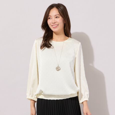 サテンをベースとした生地に、キラキラした糸をリボン状に織り込んだ、華やかな印象の素材で作ったブラウス。