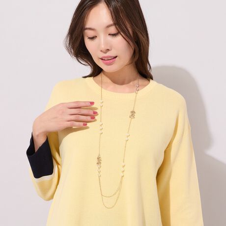 フェイクパール×ゴールド調チェーン使用のロングネックレス。