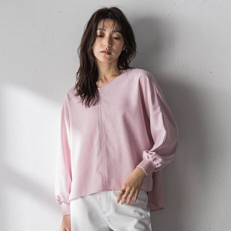 ゆるやかなVネックと、たくし上げもきまるギャザーを寄せた袖口RIBがポイント。