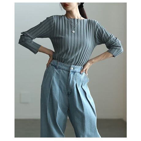 【トップス】 レディース 長袖 リブ ブルー アイボリー グレー オレンジ ブラック 春 秋 冬