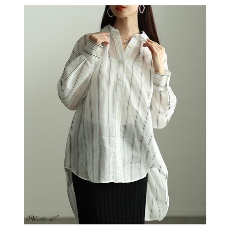 シアーなストライプ柄が軽やかなチュニックシャツ。一枚持っていると何かと頼れる存在で、前後差のあるデザインが気になる下半身をさりげなくカバーしてくれます。トップスとしても羽織りとしても使える、着回し力の高い一枚です☆