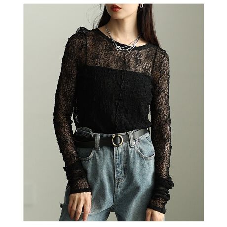 【トップス】 カットソー インナー 総レース 花柄 ラウンドネック 長袖 レイヤード ブラック 黒