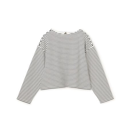■デザインリラックス感のあるワイドシルエットが魅力のボーダーTシャツ。ゆったりとした身幅にクロップド丈と、ゆとりを持たせたスリーブのシルエットが、程よい抜け感を演出してくれます。首元をすっきりと見せるボートネックラインがポイントです。後ろにはゴールドのメタルジップを配し、カジュアルなボーダーアイテムに上品さをプラス。長めのジップ仕様で、着脱のしやすさにも配慮しています。伸縮性も良く、動きやすさにもこだわった一着です。