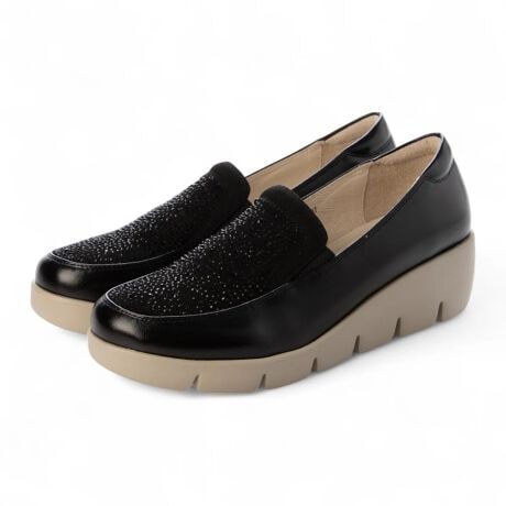 足元に華やかさを添える、大人のためのラインストーンスリッポンアッパーに贅沢にあしらわれたラインストーンが、光の角度で上品にきらめき、シンプルな装いのアクセントにぴったりです。クッション性の高い厚底ソールで履き心地も快適。すっきりとしたフォルムとスリッポンタイプのデザインで、脱ぎ履きしやすく、毎日のコーデに取り入れやすい一足です。カラーバリエーションブラック:フォーマル感もある万能カラー。ブロンズ:落ち着いた中に華やかさをプラス。ホワイト:透明感と女性らしさが際立つライトトーン。特徴キラキラ輝くラインストーン装飾柔らかい履き心地とフィット感衝撃吸収性のある厚底ソールで疲れにくいスリッポンタイプでサッと履けるデイリーにもお出かけにも対応