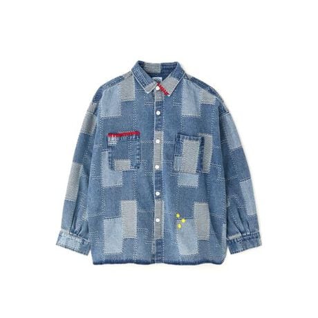 デニムのパッチワークの各所にステッチを加えたシャツ。