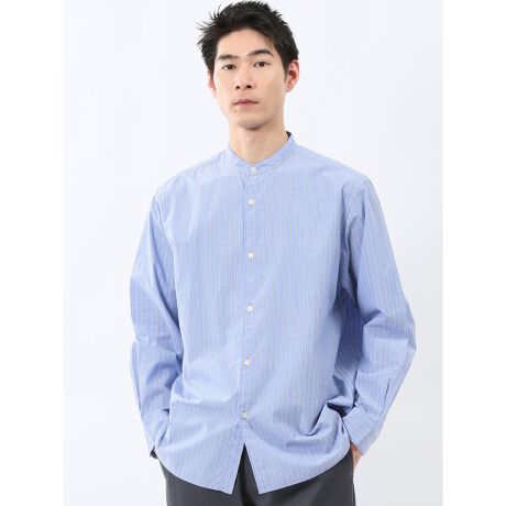 首回りがすっきりとして見えるバンドカラーの長袖シャツです。清潔感のあるストライプ柄でクリーンな印象に仕上げています。キチンと見えするので、プライベートやオフィスカジュアルにオンオフ兼用で大活躍してくれます。