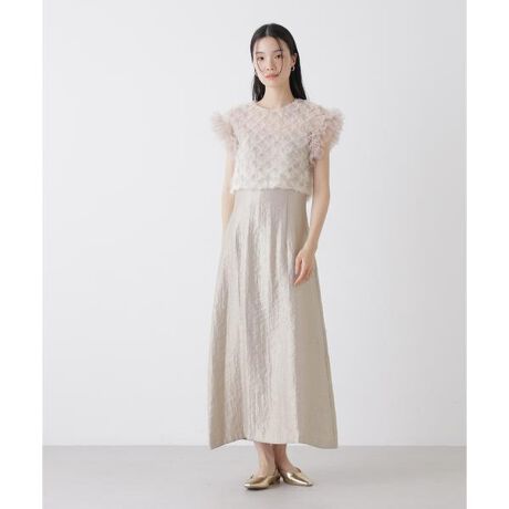 存在感たっぷりの立体チュールブラウスが目を惹くドレス。キャミドレスはカップ付きでインナーに悩まず着用いただけます。程よい光沢感のサテンドレスとキャッチーなブラウスで、結婚式などパーティーシーンにはもちろん、ちょっとしたお出かけやお食事等にもおすすめです。