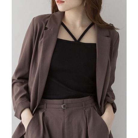 フロントの紐がVデザインに見える為、首元や胸元をスッキリ綺麗に見せてくれます。