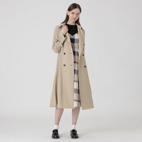 [型番:55A03714__]◆ワンピースのようにも着れるトレンチコート【Design】落ち感のある素材を使用したドレストレンチコートです。前を閉めてベルトをしめればフィット&フレアーラインが美しいワンピースのように着用できます。フードも取り外し可能なので様々なスタイリングを楽しんでいただけます。後ろのインバーテッドプリーツから覗くクレストブリッジチェックがアクセントになり、後ろ姿も可愛い一着です。