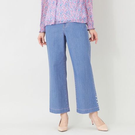 タテ糸にコンパクトヤーンを使用することで、毛羽立ちを抑えたソフトでクリアな風合いと、上品な光沢感のデニム生地を使用しています。