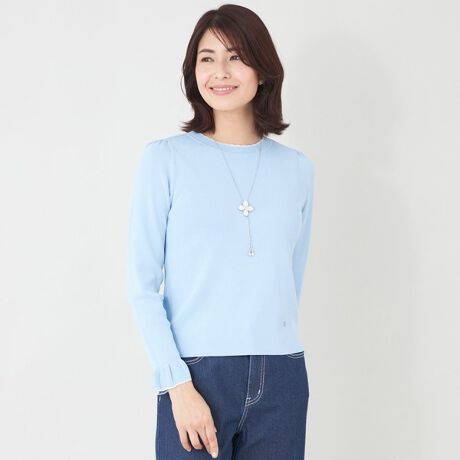 レーヨンナイロン糸に極細ラメ糸を編み込むことで、さりげない華やかさをプラス。両脇をリブ編みに切り替えることで、ボディラインをすっきりと見せる細見え効果のあるデザインに仕上げました。インナーとしても一枚着としても活躍する、汎用性の高いアイテムです。