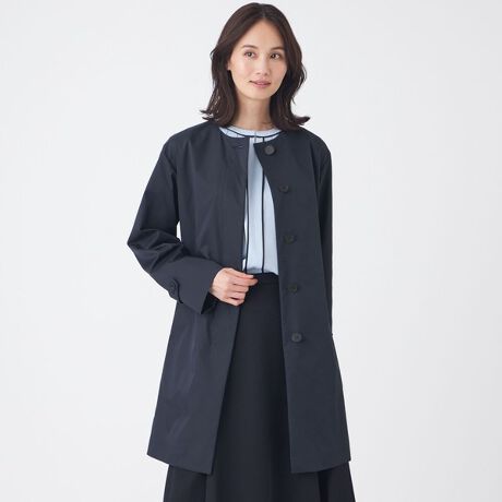 比翼仕立てにすることですっきりとした印象のコートです。前中心の第一ボタンをメタルボタンにしてアクセントをつけています。春先まで対応できるよう半裏です。裾に向かって少し広がったややAラインで、後ろ身頃のボックスタックでシルエットを出しています。後ろ中心の飾りタブもデザインポイントです。はっ水機能付きですので雨の日も安心して着て頂けます。