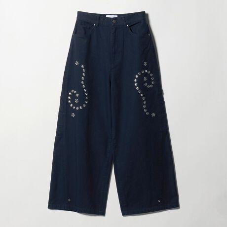 遊びのある装飾が目をひく、大きめなメタルパーツ使いのパンツ。