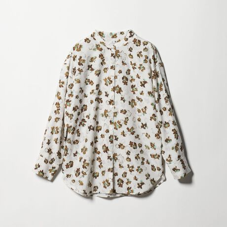 装いに華やかさを添えるフラワープリントのバンドカラーシャツ。