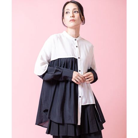 [型番:501006-479B]レイヤードライクな切替で、動くたびに靡くドレープが軽やかなブラウス。春らしいペールカラーからシックなモノトーンまで、気分に合わせてカラーをチョイス。===========================透け感: ややあり(WHITE部分)伸縮性: なし光沢感: なし裏地: なし素材について: 落ち感のある柔らかいブラウス地===========================