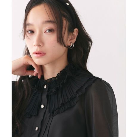顔回りを華やかにさせるプリーツカラーのシアーブラウス。