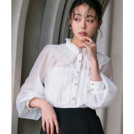 顔回りを華やかにさせるプリーツカラーのシアーブラウス。