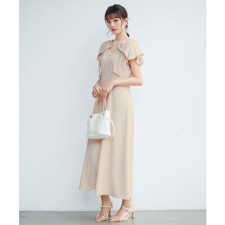 リボンショルダーデザインが女性らしいロングワンピース。