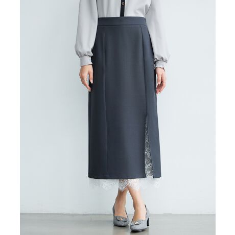 裾からはちらりと覗くレースがあしらわれています。ベーシックなタイトスカートに華やかさをプラスします。