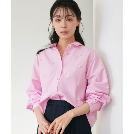 煌めくパールをちりばめた、上品モードなシルエットのクロップドシャツ