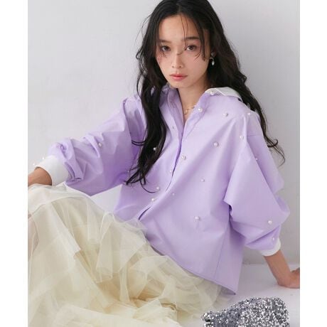 煌めくパールをちりばめた、上品モードなシルエットのクロップドシャツ