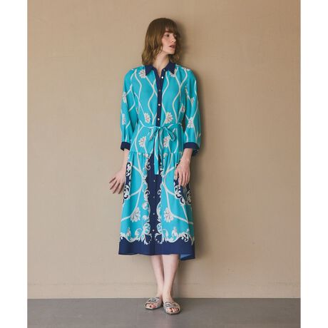 【Japan Fabric】 一枚で品よく決まる大人のシャツワンピース。ソフトでふくらみのある上質な日本製ポリエステル地にオリジナルプリントをのせた、クラス感溢れる一着。シルクのような光沢とドライなタッチが、シーズンらしい軽やかで上品な着心地を叶えます。一枚のヴィンテージスカーフから着想を得た柄は、チェーンやクラシカルなグラフィックを組み合わせ、さらにワンピースのパターンに合わせて緻密に計算しながらプリントする事によって、360度どの角度から見ても華やかに決まる一枚に。スカートの切替えからダイナミックに配された柄が一際目を引き、一枚で美しい存在感を放つワンピースに仕上がっています。襟や前立て・裾は締め色で全体をまとめてキリっとシャープなムードをプラスし、Glace Classらしい品格のあるデザインに。歩いた時の優しい揺らぎも、より一層上品な大人な装いへと導いてくれます。衿付き・袖あり・膝下の露出度控えめなデザインは、お呼ばれシーンやお食事会などの特別な場面にもぜひおすすめです。