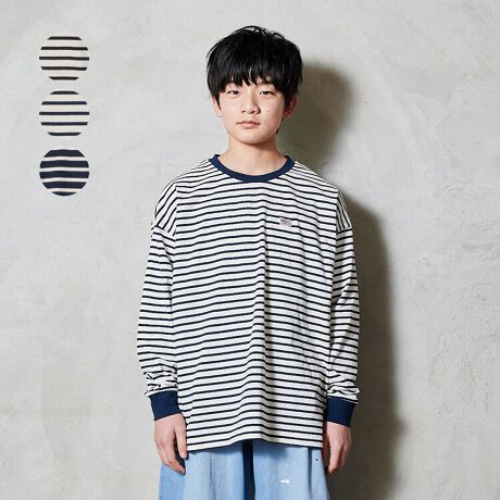DaddyOhDaddyから新しく120〜170cmのスクール、ジュニアアイテムライン。直営店では直営オンラインショップ「こどもの森e-shop」各店のみでの販売になります。【直営実店舗での販売はありません。】シンプルでベーシックなボーダー柄の長袖Tシャツ、ロンT。ドロップショルダー、肩落ちデザインのゆったりシルエット。袖口はリブになっているので、腕まくりしても袖が落ちにくいのもポイント!ゆったりシルエットでママにもオススメ!【アイテム】トップス カジュアル お洒落 オシャレ かっこいい かわいい 可愛い 普段着 デイリーウェア お出かけ着 お外着 お外遊び着 子ども服 こども服 男児 男の子 ボーイズ キッズ トドラーサイズ 幼稚園 保育園 小学校 通園 通学 小学生 2026年春夏物新作 丸高衣料 ロングスリーブ 長袖 ジュニアサイズ スクールサイズ 男女兼用 ユニセックス 女児 女の子 ガールズ 中学校 中学生 高校生 修学旅行 林間学校 校外学習 遠足 ダディオダディ ネイビー 紺色 ブラック 黒色 コットン100% 綿100%