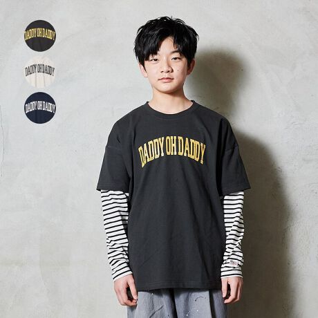 DaddyOhDaddyから新しく120〜170cmのスクール、ジュニアアイテムライン。直営店では直営オンラインショップ「こどもの森e-shop」各店のみでの販売になります。【直営実店舗での販売はありません。】ロゴプリントの半袖Tシャツとボーダーの長袖Tシャツを着ているような重ね着風デザイン。1枚で重ね着が楽しめる長袖Tシャツ、ロンT。綿100%でギフトやプレゼントにもオススメ!【アイテム】トップス カジュアル お洒落 オシャレ かっこいい かわいい 可愛い 普段着 デイリーウェア お出かけ着 お外着 お外遊び着 子ども服 こども服 男児 男の子 ボーイズ キッズ トドラーサイズ 幼稚園 保育園 小学校 通園 通学 小学生 2026年春夏物新作 丸高衣料 ロングスリーブ 長袖 ジュニアサイズ スクールサイズ 男女兼用 ユニセックス 女児 女の子 ガールズ 中学校 中学生 高校生 修学旅行 林間学校 校外学習 遠足 ダディオダディ ブラック 黒色 オフホワイト 白色 ネイビー 紺色 コットン100% 綿100%
