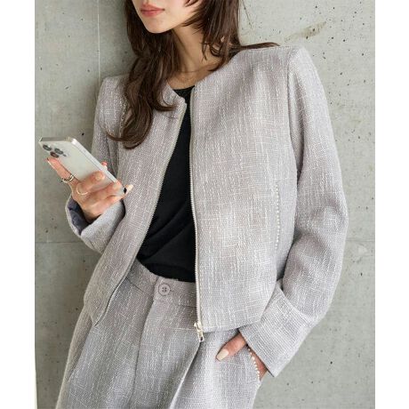 タートルやハイネックトップスとも相性よく女性らしさ引き立ててくれるノーカラージャケットです。