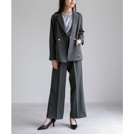 スーツ レディーススーツ パンツスーツ セットアップ ダブルジャケット テーラード ワイドストレートパンツ センタープレス ハンサムスーツ きれいめスーツ 洗えるスーツ 通勤 デイリー 杢調