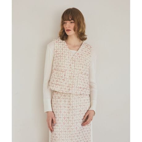 フランスのJulesTournier(ジュールトルニエ)社のピンクとシルバーの糸が格子柄に織り込まれた上質感のあるツイード地のショートジレ。
