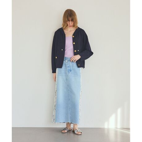 [型番:0226103041]レーヨンナイロンの細番手の糸を使用し、ダブルジャガード編みでハリ感を出したマリン釦がポイントのニットフーディ。※こちらのモデル着用画像はサンプル品を撮影しております。実際の商品と仕様、加工、サイズが若干異なる場合がございます。予めご了承くださいませ。