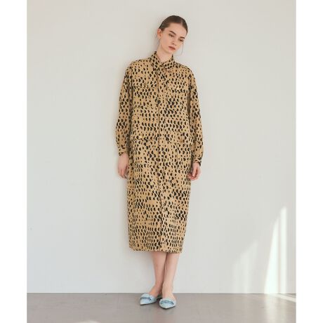 【Japan Fabric】 クラシカルなムード漂う、大人のサファリドレス。シャリ感のある強撚糸を使用したリネンライクな素材にヴィンテージ感のあるハーフドット柄をのせる事で、他にはない新鮮な表情に仕上がっています。ランダムな配置ながらバランスを緻密に計算した柄は、どの角度から見ても上品に着映えます。ゆったりとしたリラクシーなシルエットで、大人のニュアンスとこなれ感をプラス。そのまま一枚でワンピースとして着るのはもちろんの事、フロントを開けて羽織りとしても着用できるお品となっています。