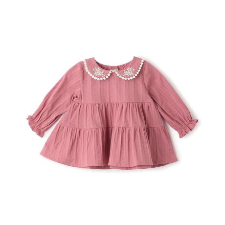 衿元にサクラの刺しゅうとフリルをあしらったブラウスです。程よく広がるティアードデザインで、スタイリングに華やかな印象を与えてくれます。上品な表情感のある、やわらかな肌触りの綿素材を使用。バックネックはゴム入りの設計になっており、お着替えも簡単です。