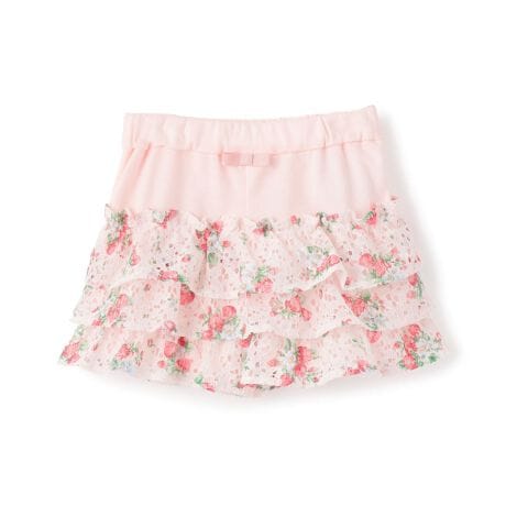 いちごプリントのレースフリルを重ねた華やかなパンツです。