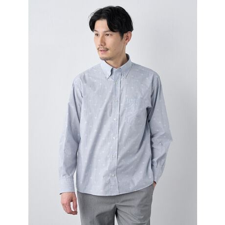 【 さりげなく主張するストライプシャツ 】シンプルなストライプにジャカード織で小紋ダイヤ柄を配した生地を使用した長袖シャツ。さわやかな色合いのボタンダウンシャツは、カーディガン・スウェット・ジャケット・ブルゾンなど、幅広いアイテムとの着合わせが可能。コットン/ポリエステル素材の生地は程よいハリ・コシがあり、洗濯時の伸び・縮みが少なく扱いやすい原料で、洗濯やアイロンのお手入れがしやすいところもおすすめのポイント。
