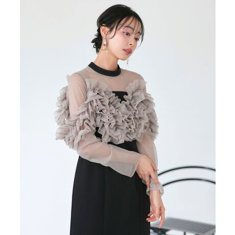 ボリュームたっぷりのチュールフリルが視線を惹きつける、存在感ある1枚