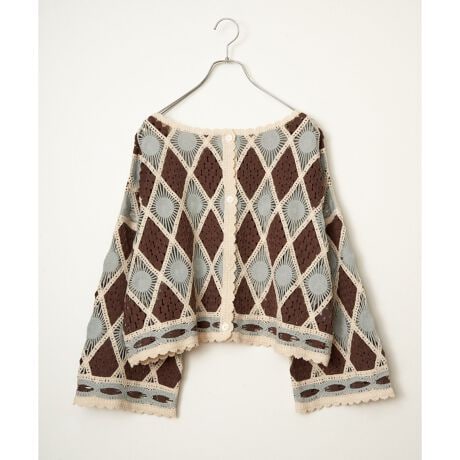 [型番:26921086]クロシェ風のモチーフレースを使用した、表情豊かな2WAYトップス。前後どちらでも着用でき、カーディガンとしてもプルオーバーとしても楽しめます。全体を華やかに彩り、コーディネートに新鮮さとあたたかみをプラスするアイテム。【素材】綿混ニット。モチーフレース編み。【デザイン】羽織りとプルオーバーの前後2WAY。【ポイント】前開きボタン付きで羽織りでも着られるデザインに進化しました。無地バージョンも新登場です。