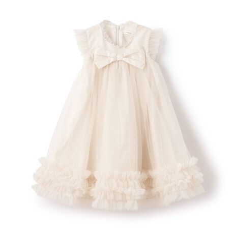 全体にギャザーフレアーを入れてふんわり感を出演し、裾のフリルでチュールに動きをプラスしました。