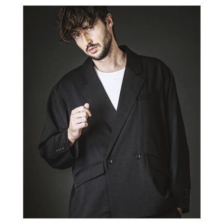 交差する背面のアシンメトリーデザインが印象的な、ダブルブレスト仕様のオーバーサイズジャケット。