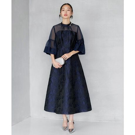 陰影が織りなす上質ジャカードにさりげない艶とシアー感で、品よく華やぐ一着。