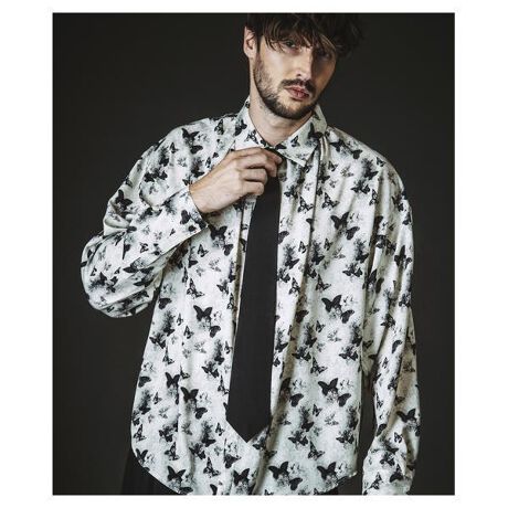 継続して高い人気を誇るネクタイ付きシャツを、蝶をモチーフとした総柄パターンでアップデートしたBIGシルエットシャツ。