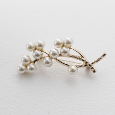小粒のパールを使ったリーフモチーフなデザインは、シンプルでフォーマルの装いにもぴったりなブローチ。