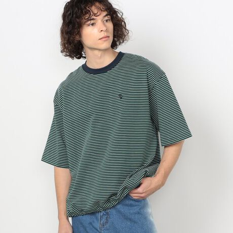 落ち着いた色あいのボーダーに衿を配色にしてリンガーTシャツ仕様にすることでアクセントにしました。